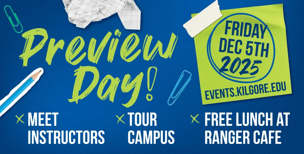 Kilgore College will host its annual Ranger Preview Day on Friday, Dec. 5, 2025 to give potential students an opportunity to learn more about the educational opportunities KC offers. Attendees will have the chance to visit with instructors and current students, check out campus life and have a free lunch in the Ranger Café.